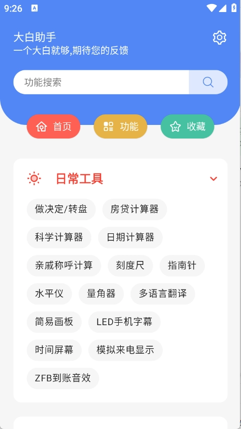 大白助手是一款便捷的手机工具箱,拥有丰富的资源,包含计算器、日历、天气等多种实用工具。所有工具均支持即点即用,详细的分类功能能帮助用户快速定位所需工具。此外,工具库还会持续更新,以满足不同用户的多样化使用需求。
