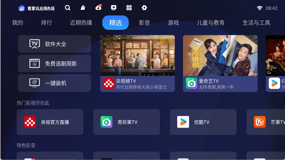 看家鸟市场是专为电视端打造的应用商店,涵盖影视、游戏、音乐等丰富多样的应用类型。平台上每款应用都配有详细的截图与功能介绍,助力用户充分了解软件特性;同时设有清晰的分类导航和热门排行榜,还能适配市面上多种主流电视机型号。