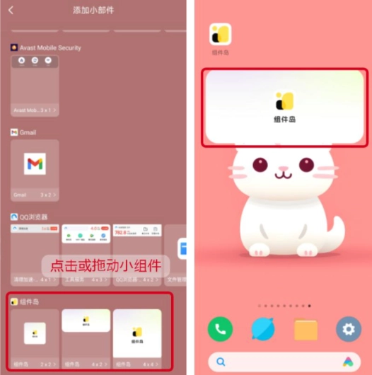 在列表找到【组件岛】,选择对应的小组件尺寸,点击或拖动小组件到桌面。