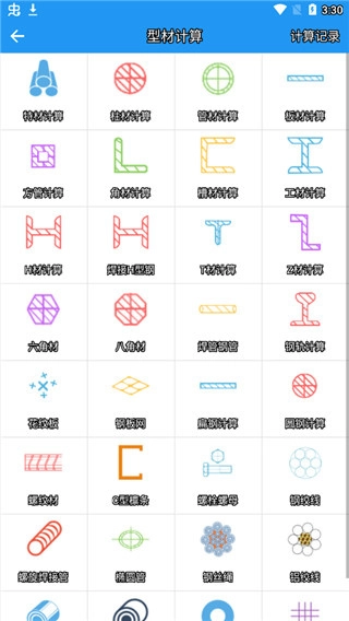 2、我们进入到型材计算功能里面,里面又包含了很多的计算模式,都能够很精确的帮助您计量,转换数据。接下来可以随便进入一个计算类型,小编为您演示的是特材计算。