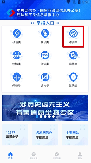 1、打开网络举报平台,在首页区域找到并点击您需要举报的类型按钮,此处以诈骗类为例;