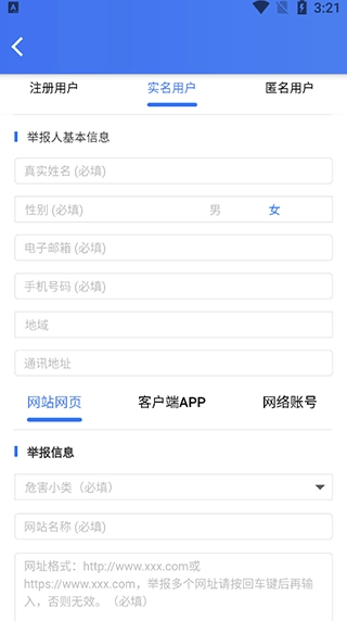 3、选择实名举报或匿名举报,接着填写基本信息;