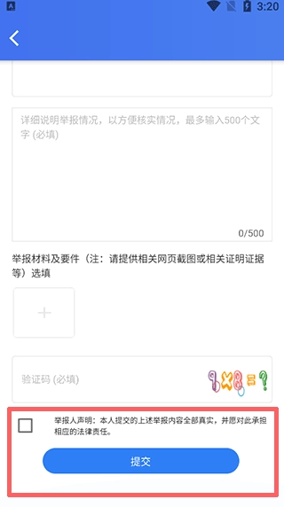 4、勾上“举报人声明”,最后点击提交。