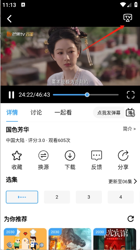 1、打开一部影视作品并进入播放页面,接着点击页面右上角的“TV”按钮。