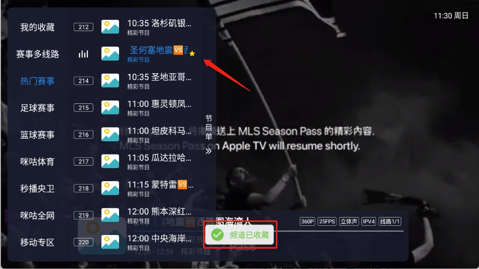 4、长按想要收藏的电视频道以后就可以收藏了。