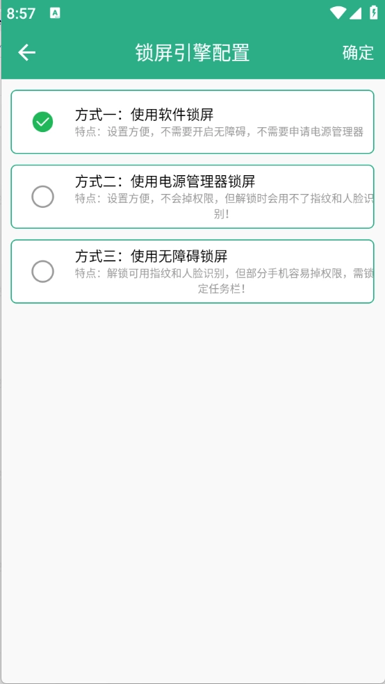 2、来到首页页面,可以通过软件锁屏、电源管理器锁屏以及无障碍锁屏三种方式。