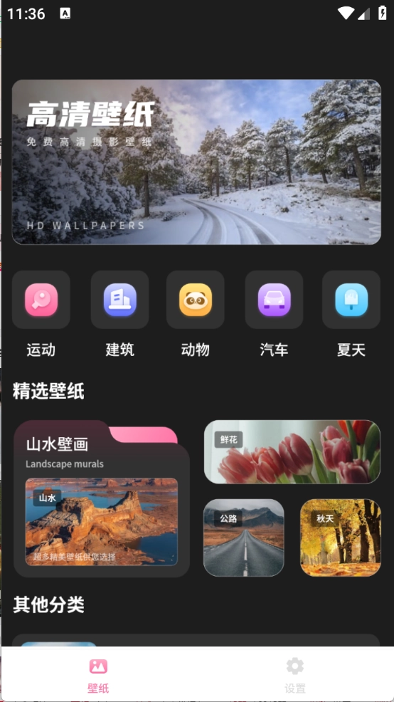 2、进入首页之后,有很多的壁纸类型,包括运动、建筑以及汽车等等。