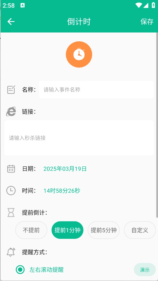 1、用户可自由设置时间,提前提醒自己进入秒杀模式,确保不错过重要活动。