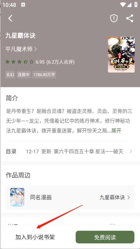 4、点开想看的小说进入详情页,接着点击“免费阅读”。