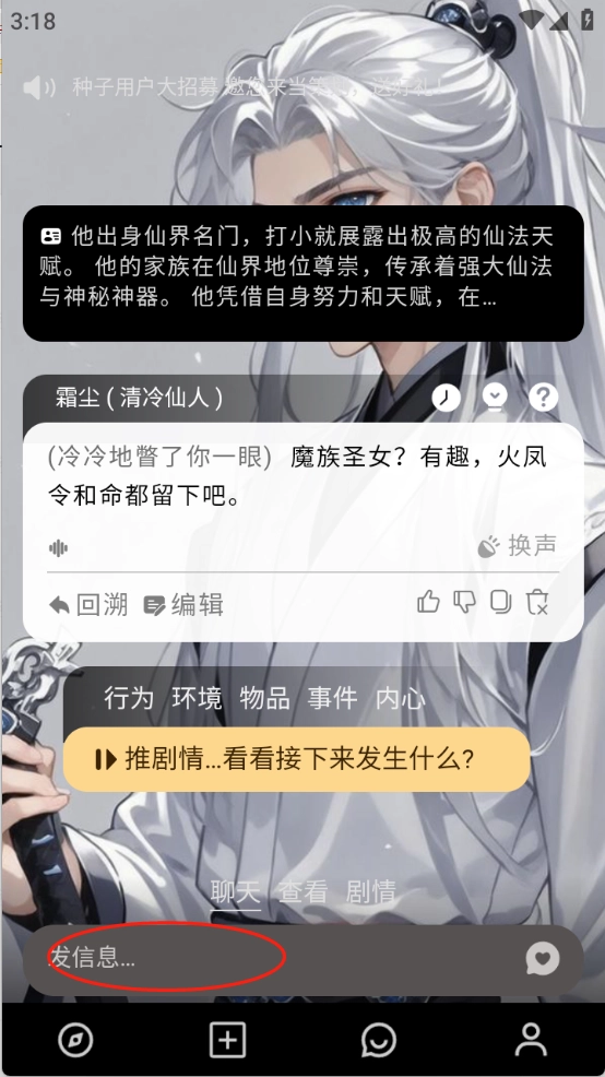4、用户直接点开喜欢的虚拟人物之后,在输入框中输入文字发送就可以开启对话了。