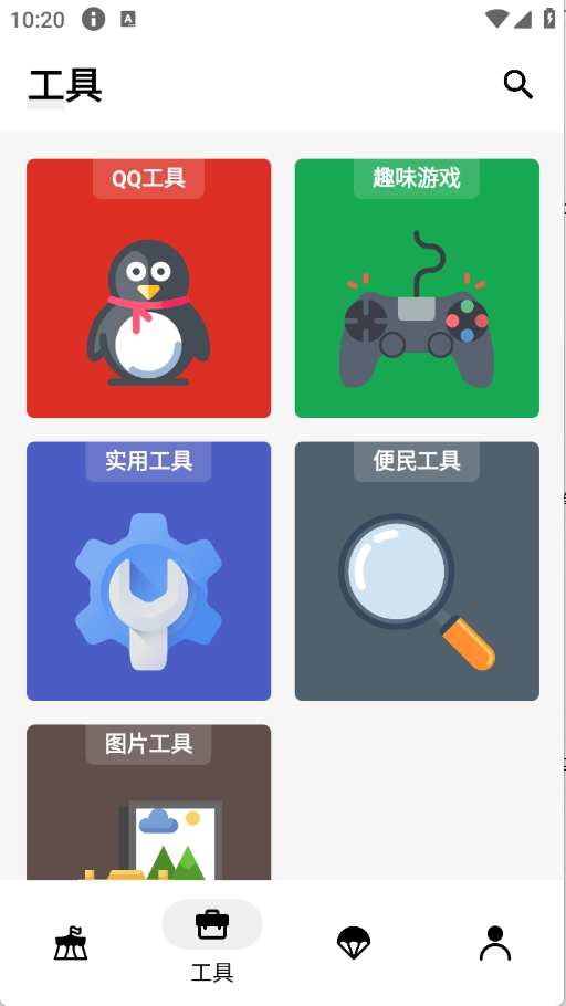 3、“工具”页面,将工具进行了详细的归类,不管是实用工具、趣味工具还是图片工具等都有。