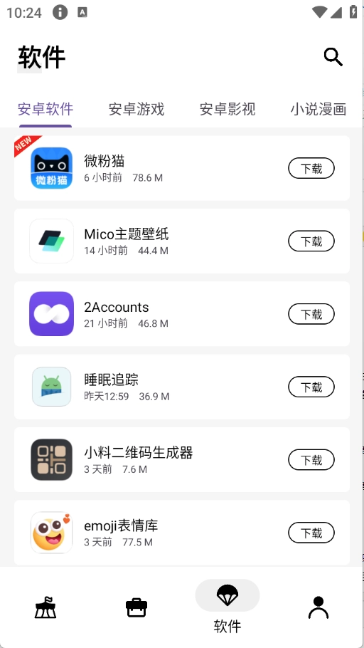 5、软件库页面将软件进行了详细的归类,安卓软件、影视类以及小说漫画类等都有。