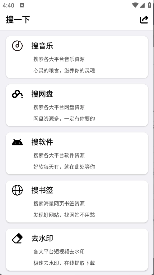 1、集合了搜索音乐、软件、网站、标签、网盘内容以及视频去水印等多种实用功能。