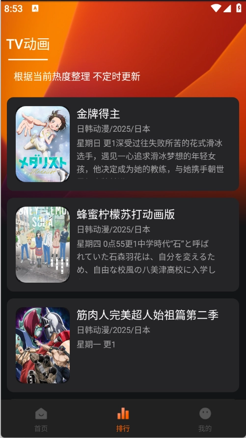 3、排行榜页面将动漫根据当前热度进行了整理排序。