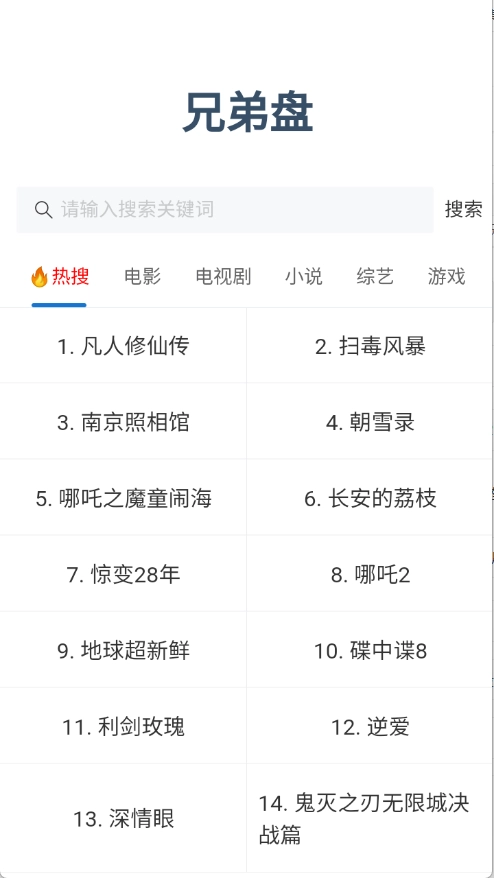 兄弟盘是一款强大的资源搜索工具,能够查找小说、影视、漫画等各类资源,所有资源类型均为免费,还可以对资源进行分享,随时都能搜索到所需的资源内容,支持阿里云盘、夸克网盘和迅雷云盘等存储平台。