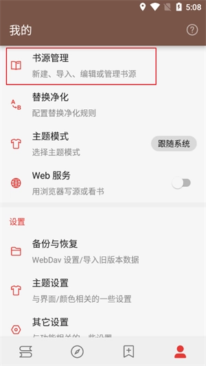 1、打开底部菜单栏中的“个人中心”,随后点击“书源管理”选项。