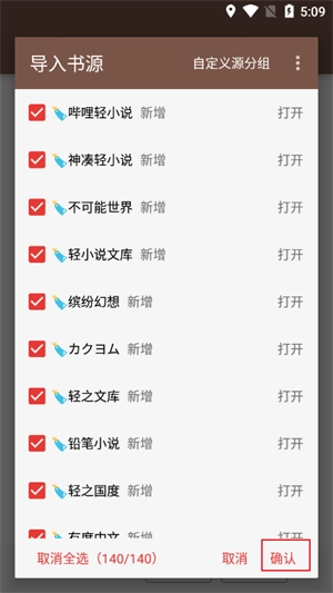 4、勾选需要导入的书源列表,再次点击“确定”完成操作。