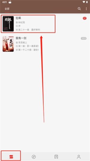 5、返回书架页面,即可看到刚刚添加的“狂飙”小说。