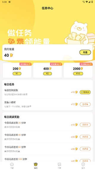 点击下方福利按钮,即可进入福利页面,完成任务获取能量,能量可以用来小说解锁章节等。