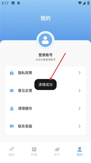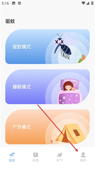 1、打开驱蚊类应用,在首页点击底部导航栏中的【我的】选项,即可进入个人中心页面。
