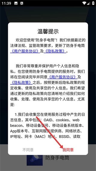 在使用“防身手电筒”之前,请先阅读《用户服务协议》与《隐私政策》,随后点击弹窗中的“我同意”按钮,即可进入应用的功能界面。