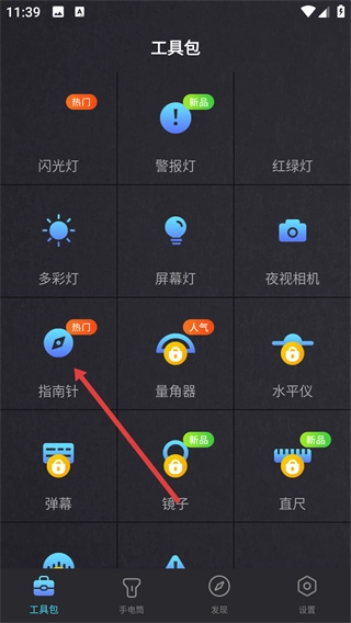2、在“工具包”界面,找到标注“热门”的“指南针”功能选项,点击该选项进入指南针的使用页面。