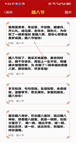 3、返回节日列表选择腊八节,进入腊八节祝福语页面,查看专为腊八节准备的祝福文案内容。