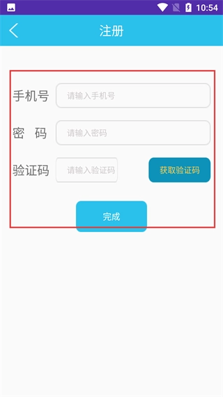 4、点击【注册】进入注册页面,需填写【手机号】【密码】,获取并输入【验证码】后点击【完成】完成注册流程。