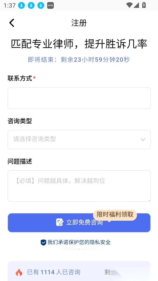 4、选择需要的咨询类型和输入详细问题描述,点击“立即免费咨询”按钮就可一键咨询了。
