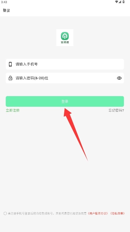 4、返回登录界面输入已注册的手机号和密码后,确认服务条款后即可成功登录。