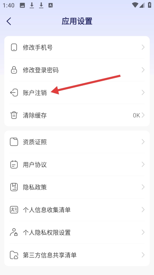 2、在应用设置界面,点击【账户注销】选项,进入账户注销流程。