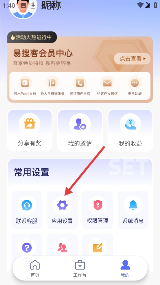 1、进入我的页面后,找到并点击【应用设置】选项,即可进入应用设置界面。