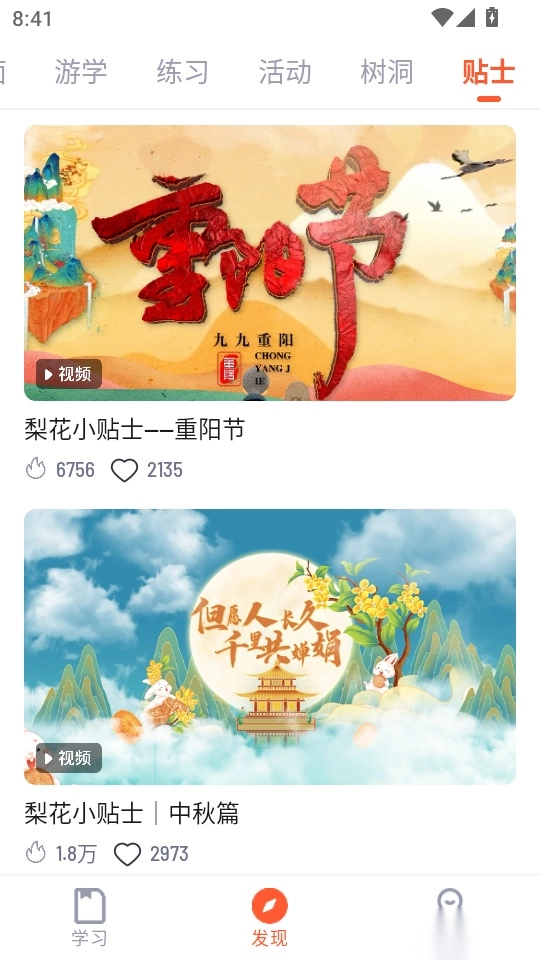 4.在“发现”功能菜单界面模块,滑动底部功能栏找到“贴士”功能后点击视频底部“❤”按钮就完成收藏了