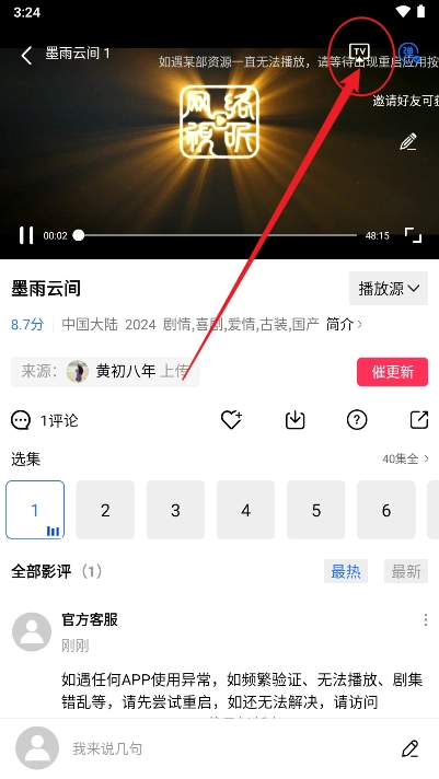 2、进入播放界面后,点击顶部的TV图标。