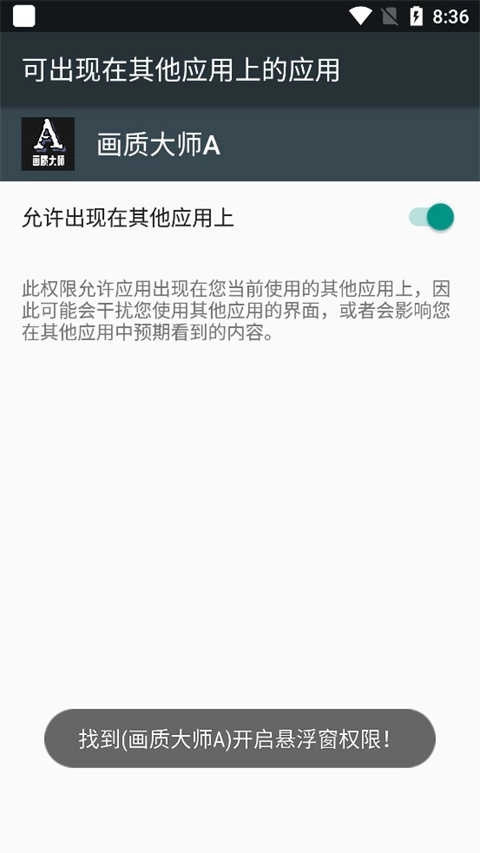 4、在应用列表中定位【画质大师A】,将其权限设置为“始终允许”,即可开启悬浮操作面板。