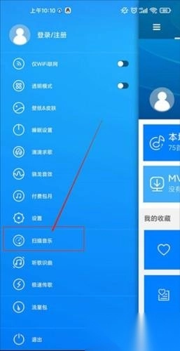 1、在本站软件,然后右滑到菜单界面,找到扫描歌曲的选项