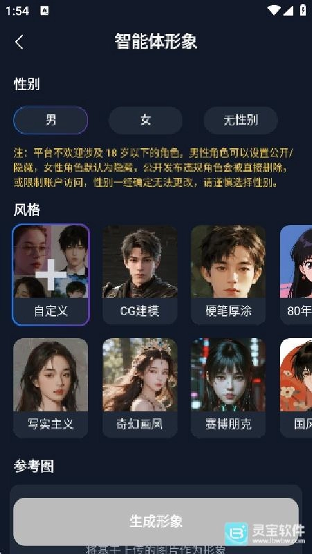 2.登录后进入角色创建页面,可以选择角色性别、风格或上传参考图片。