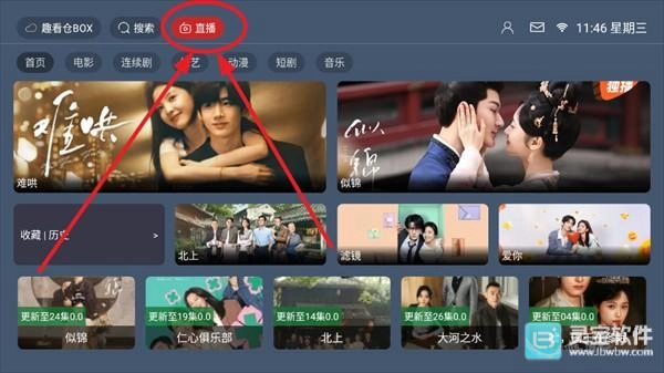 2、进入主页点击上方的“直播”进入电视直播页面。