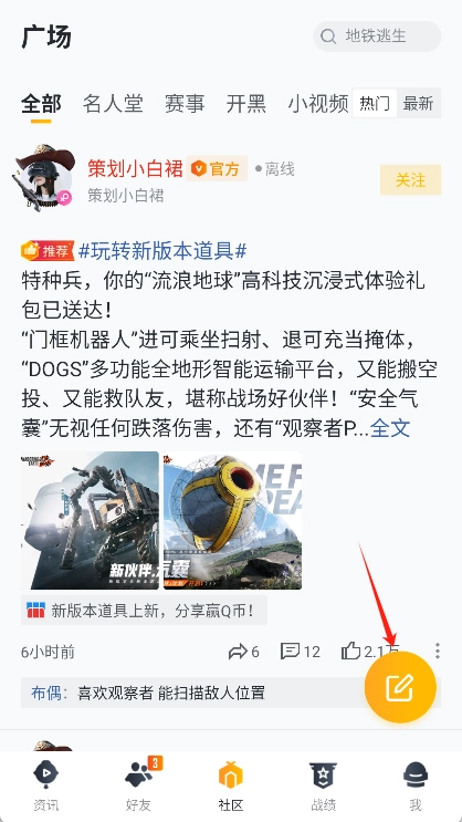 4、在“广场”页面的右下角找到并点击铅笔图标进入编辑页面。