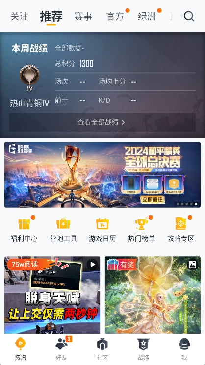 和平营地是一款为和平精英玩家量身打造的综合游戏社区应用,新版本不仅带来了最新的游戏资讯与专业的攻略建议,还支持玩家自由分享动态。用户能随时查看历史战绩,重温自己的高光时刻;同时可与游戏大神互动交流,和好友组队开黑,大幅提升了游戏体验,堪称和平精英玩家必备的实用工具。