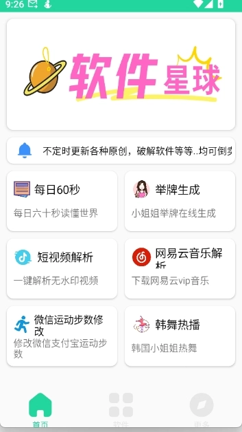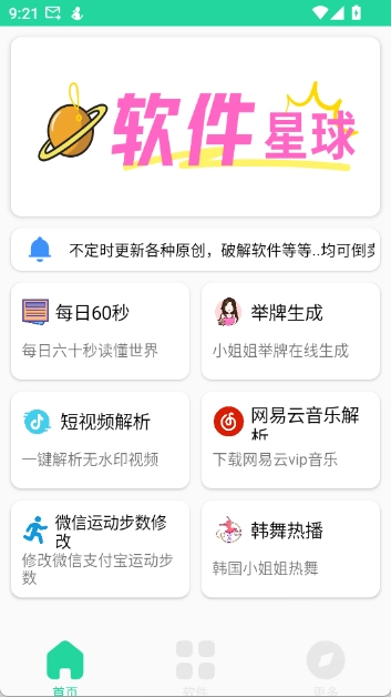 软件星球不仅仅是一个软件库,它还提供了免看漫画视频、工具箱、头像库、游戏厅、美女视频等功能,可以帮助用户解决很多问题,尤其是找应用和免费追剧。