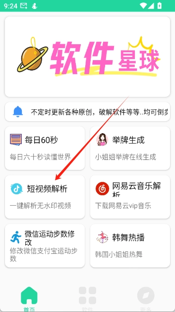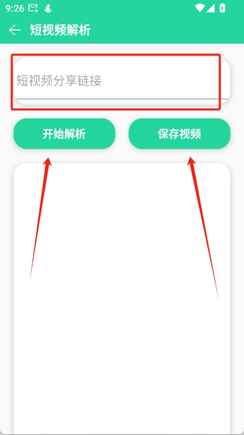 5、打开首页的“短视频解析”,将你想要解析的短视频链接复制进方框里,然后点击“开始解析”,等解析完成之后点击“保存视频”就能将解析后的视频保存到手机上