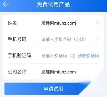 3.也可以试用体验一下,点击免费试用,然后输入姓名、手机号、手机验证码、公司名称,点击申请试用。申请通过后登录即可用啦。