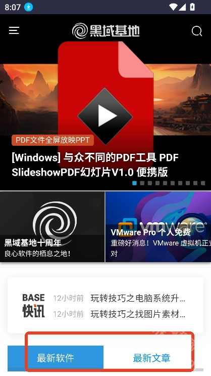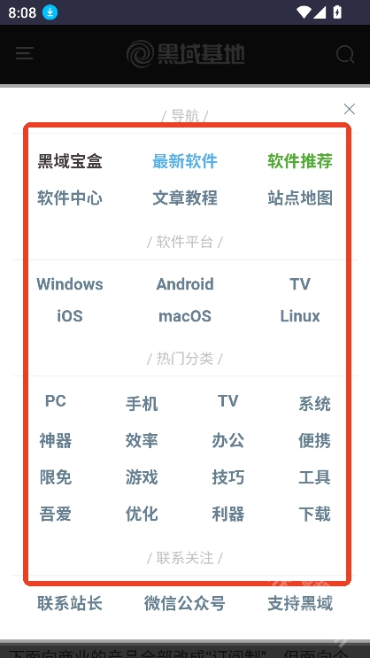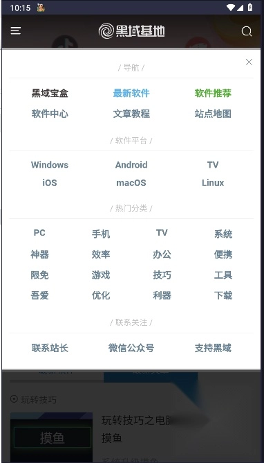 1、前往魔趣网(m.mfunz.com)并安装黑域基地手机版。进入首页后,能看到最新软件和最新文章这两个板块。