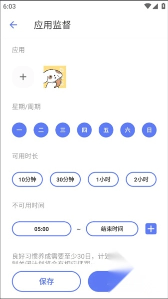 2、添加好手机应用后,可以选择周期也就是星期,提供了可用时长的区间,以及不可用时间的范围,设置完成后点击“保存”即可。