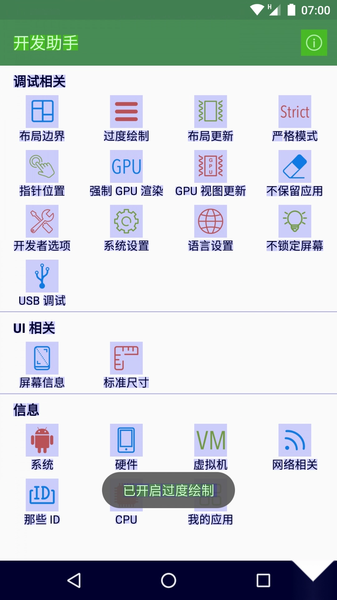 该工具集成了调试功能,帮助开发者调试应用,解决各种问题。它提供了丰富的调试相关工具,如布局边界、过度绘制以及指针位置等。