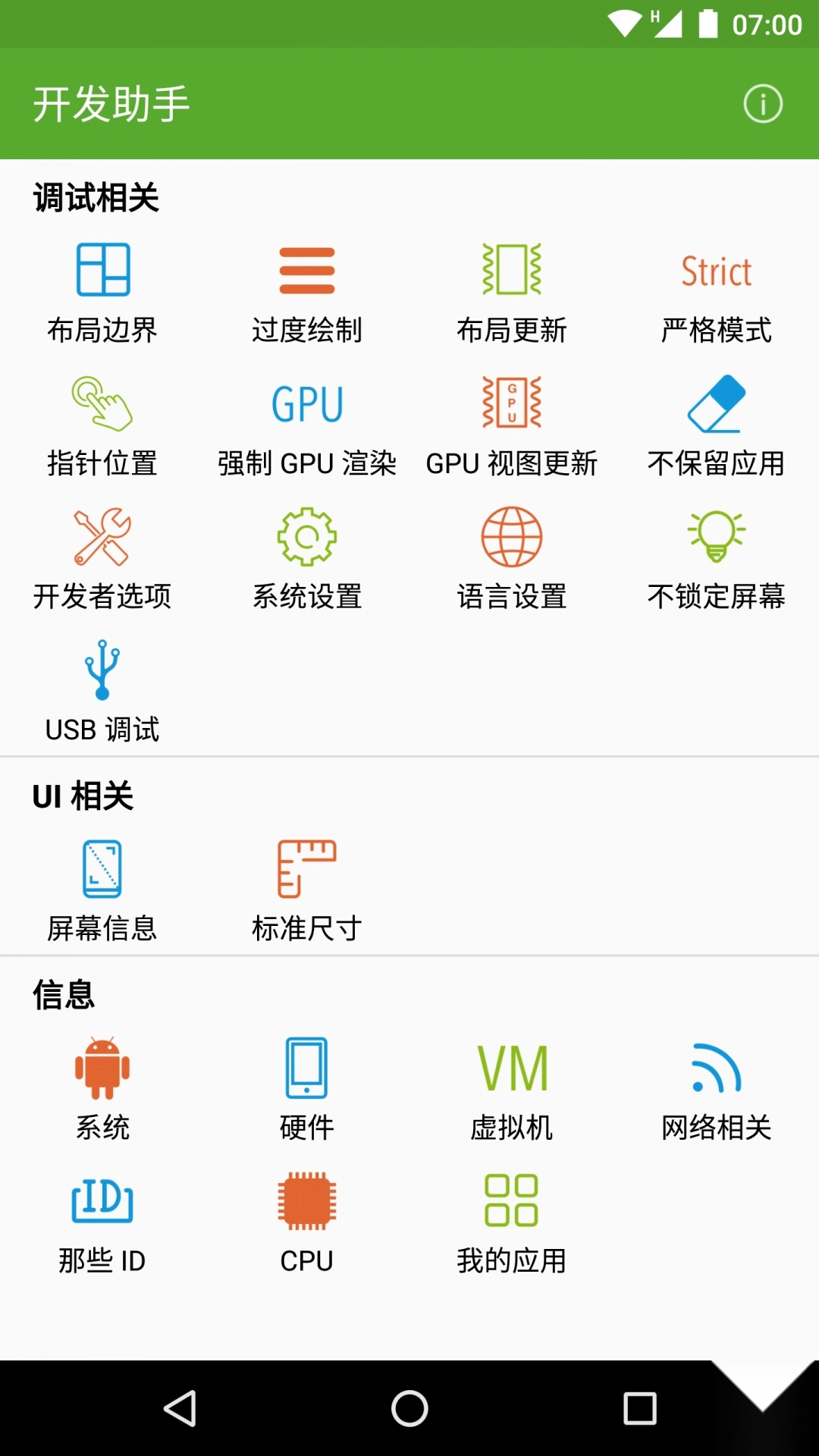 开发助手还能查看手机的软硬件信息,包括版本信息、硬件信息、屏幕信息、CPU信息、虚拟机信息、网络相关信息、ID相关信息等。这些信息对于测试不同设备上的应用表现非常重要。