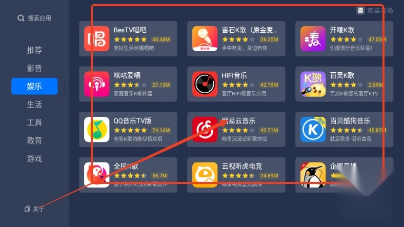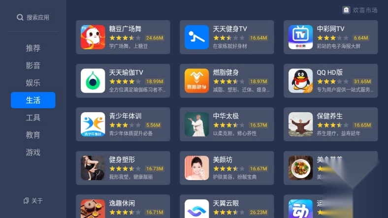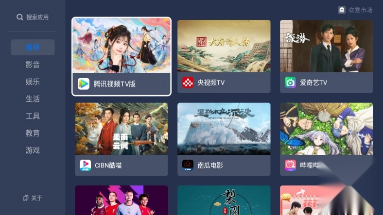 丰富的应用资源:欢喜市场TV版提供了包括电视直播、音乐软件等在内的多种类型应用,满足不同用户的需求。