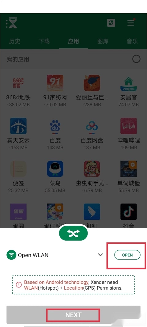 注:基于Android技术,Xender需要WLAN(热点)+定位(GPS)许可。