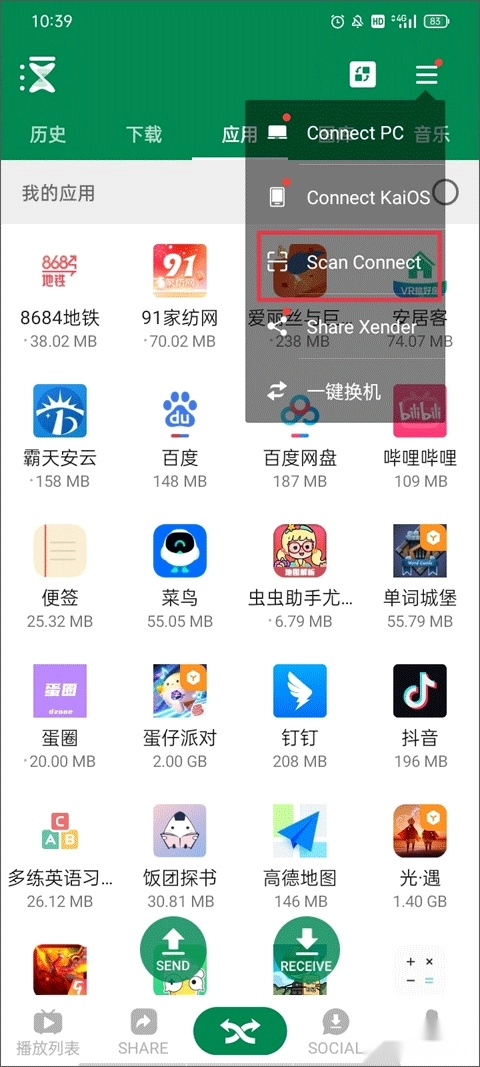 5、另外一部手机则需要点击右上方的三横图标,点击“Scan Connect”。将扫描框对准这个二维码即可快速互传相对应的应用、图片、音乐等内容。